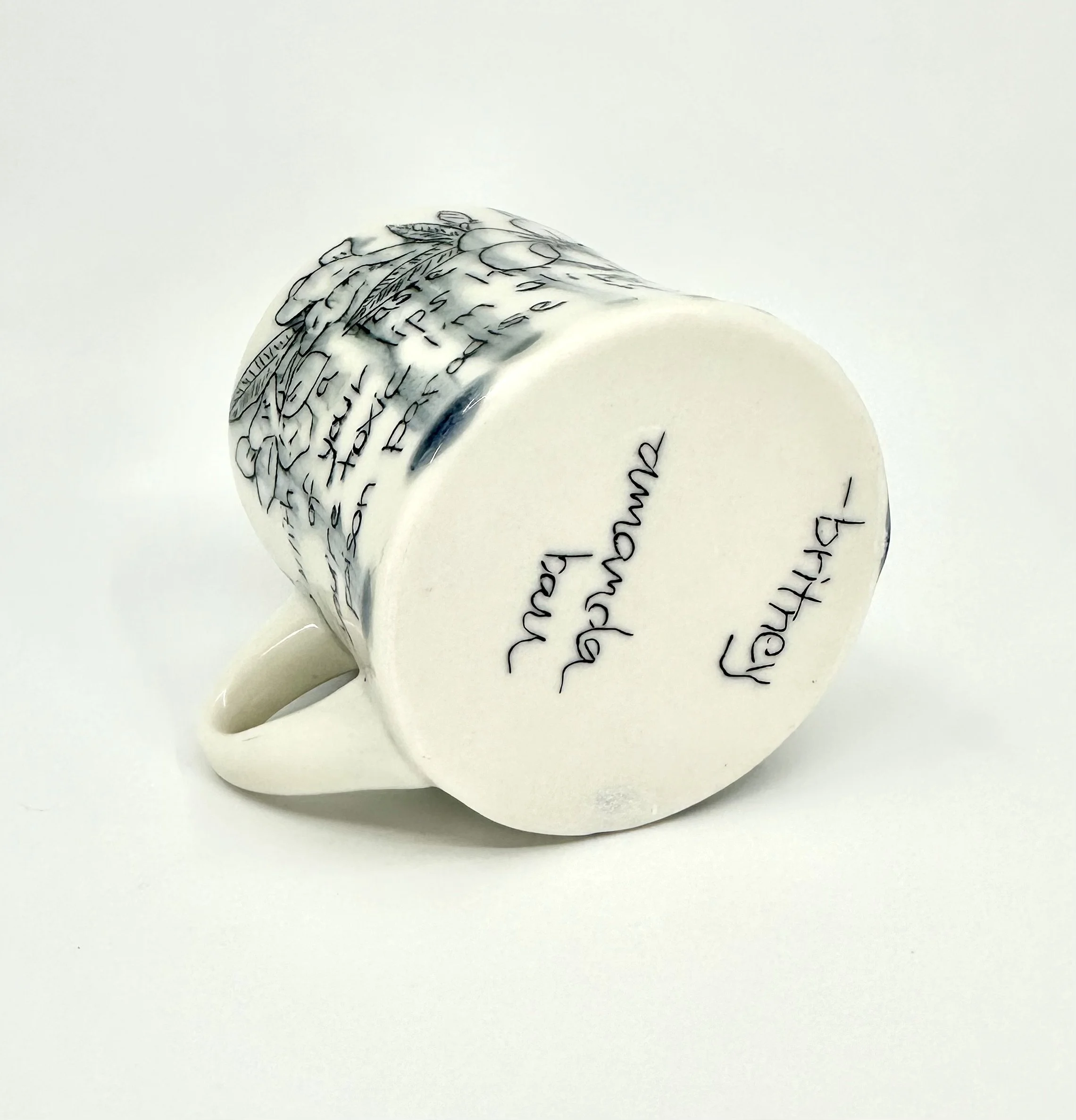 Hourglass-shaped mug with incised underglaze decoration and drippy glaze featuring the lyrics to “Toxic” by Britney Spears and illustrations of oleander flowers.